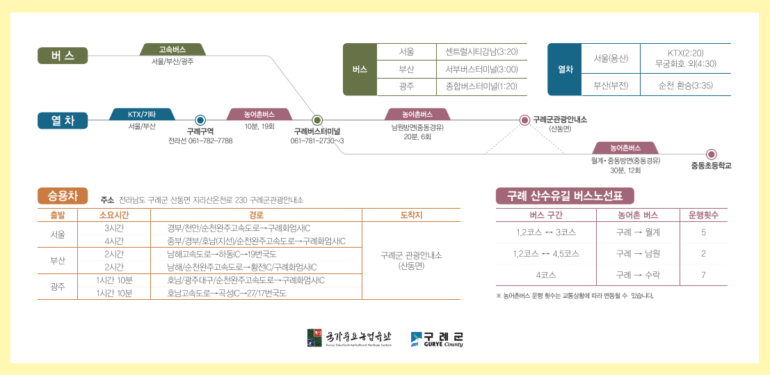 광주종합버스터미널(시외버스이용) → 곡성 경유 → 구례하차(1시간 20분 소요) |