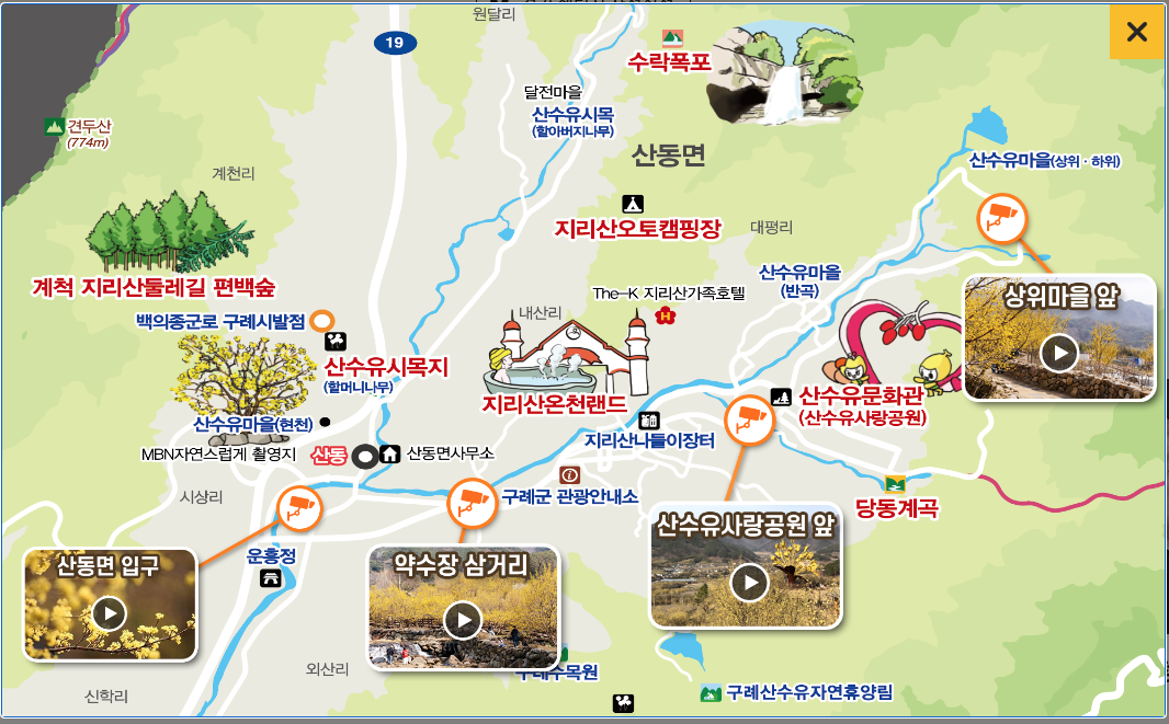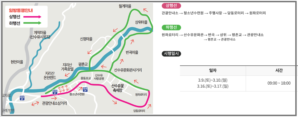※ 구례 산수유축제기간에는 교통혼잡을 줄이기 위하여 차량 통행이 일방통행된다고 합니다. 참고해 주시기 바랍니다.