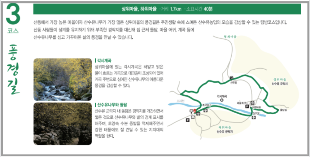 ▶ 3코스 : 풍경길/ 산수유가 가장 많은 상위마을, 산동마을 사람들의 산수유 농업을 감상할 수 있는 곳(1.7km), 40분 소요됨.