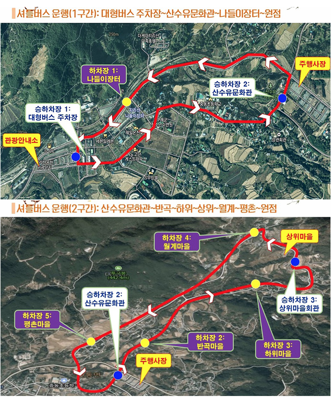 ▶ 원좌로터리 → 산수유문화관 → 반곡 → 상위 → 평촌교 → 관광안내소 → 평촌교 → 관광안내소