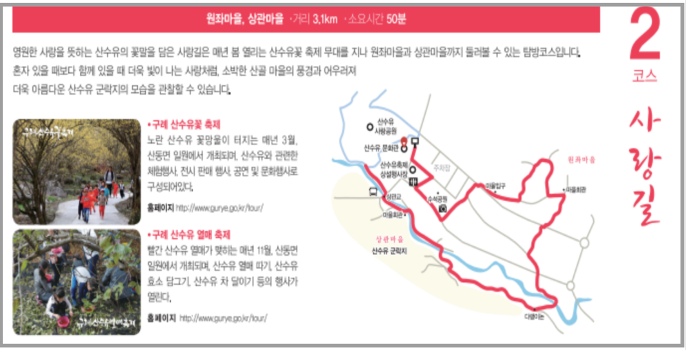 ▶ 2코스 : 사랑길/ 산수유 군락지와 마을까지 구경할 수 있음(3.1km), 50분 소요됨