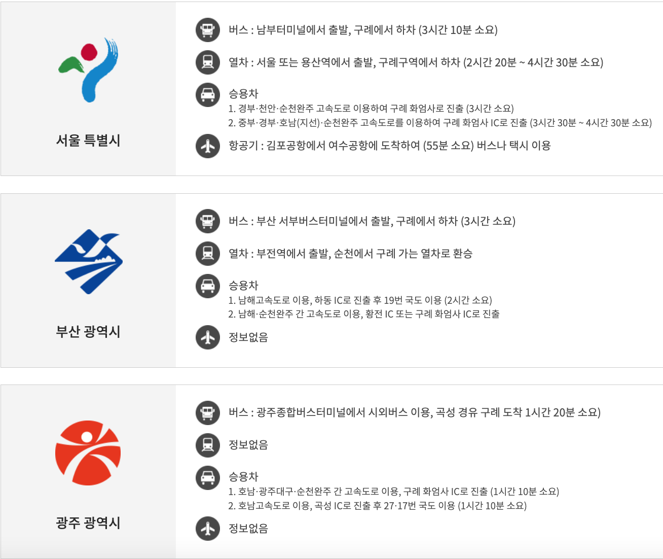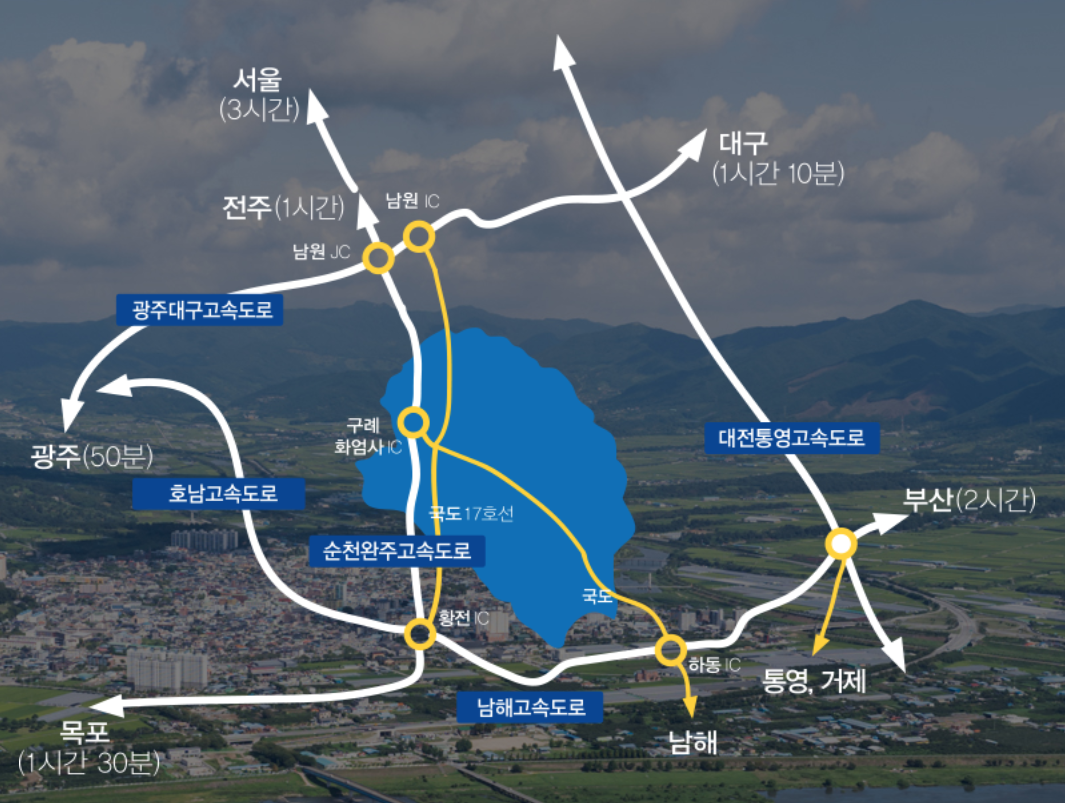 | 부산 | 2시간 | ∙남해고속도로 ⇀ 하동 IC ⇀ 19번 국도 ∙ 구례 화엄사 IC ∙남해∙순천완주 고속도로 ⇀ 황전 IC 또는 구례 IC |