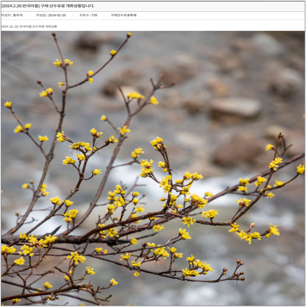구례 산수유 개화상황은 구례여행 홈페이지를 통해 정보를 알아본 결과 2월 20일을 기준으로 산수유꽃이 벌써 꽃망울을 터트려 개화를 시작했다고 합니다. 지금 진행 상황으로 봤을때 산수유축제가 시작될 때는 만개가 되지 않을까 예상이 됩니다.
