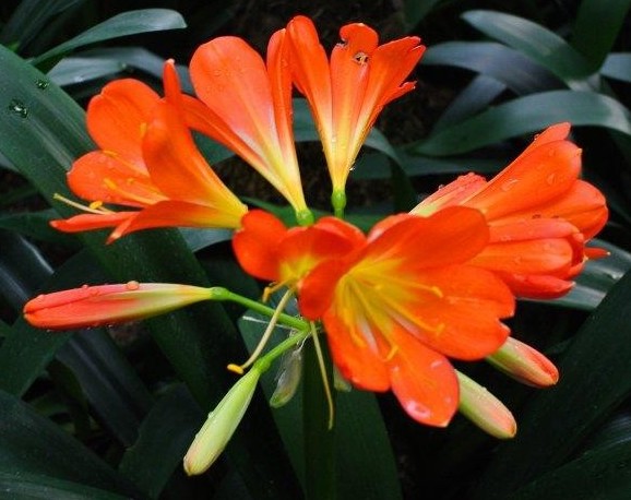 특징 | 잎 길이는 45cm이고 폭은 5cm, 짙은 녹색이며 광택이 나고 잎끝이 뾰족하며 다소 뒤로 젖혀 있음. 꽃은 잎 사이에서 편평하고 굵은 꽃대가 나와 끝에 12~20개의 꽃이 위로 향해 산형으로 달림. 꽃자루는 꽃대와 더불어 녹색이며, 꽃은 넓은 깔대기 모양으로 주황색임. 꽃 개화시기는 1~4월임 |