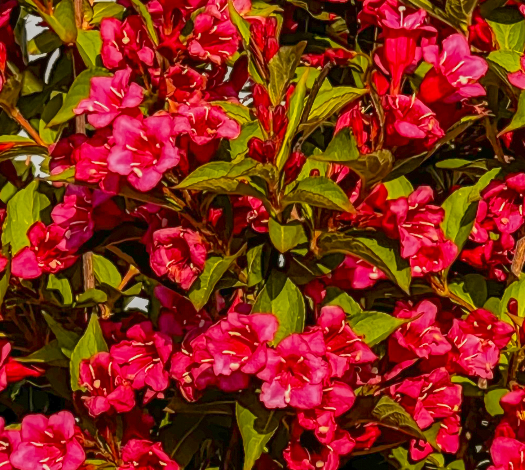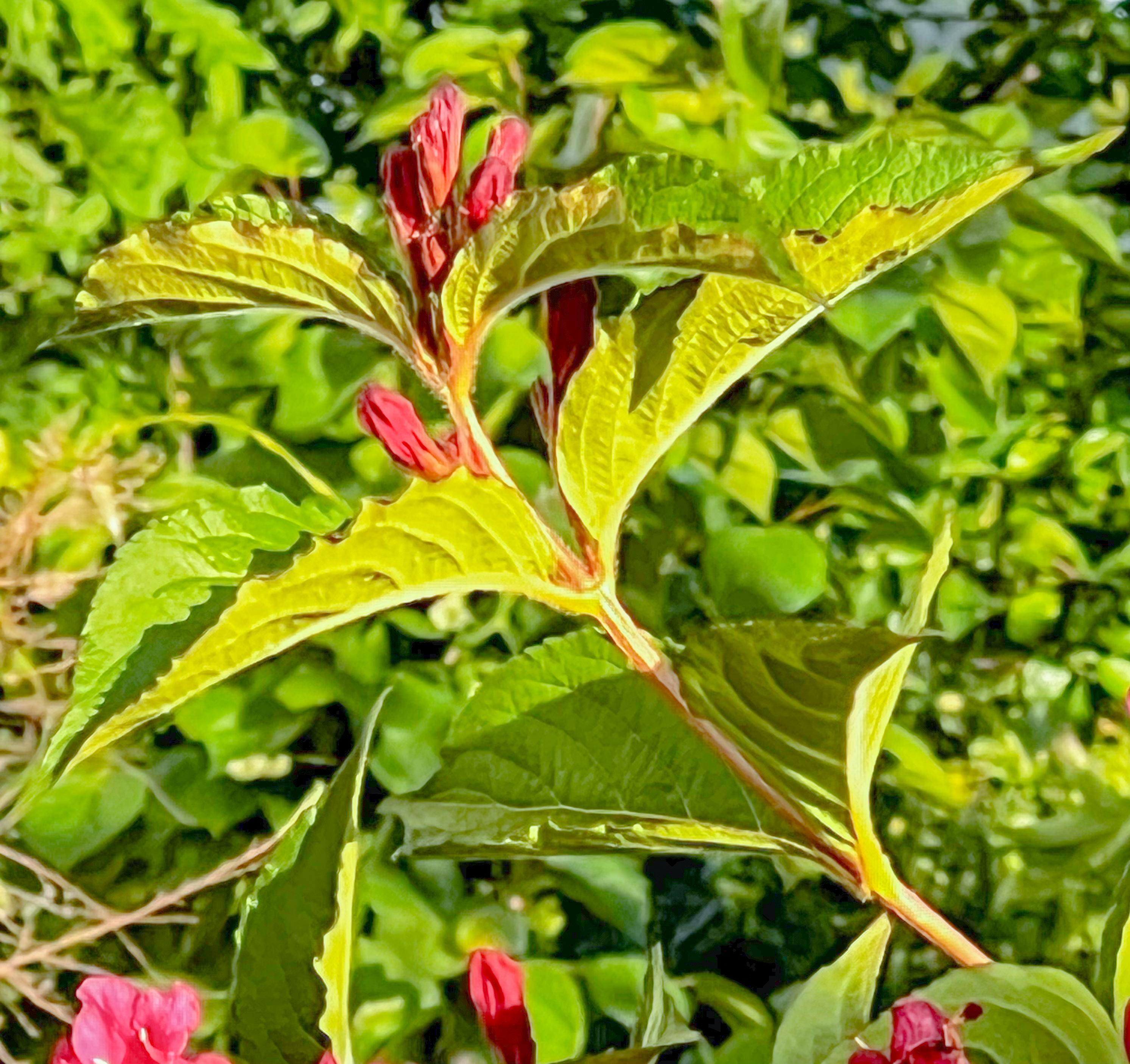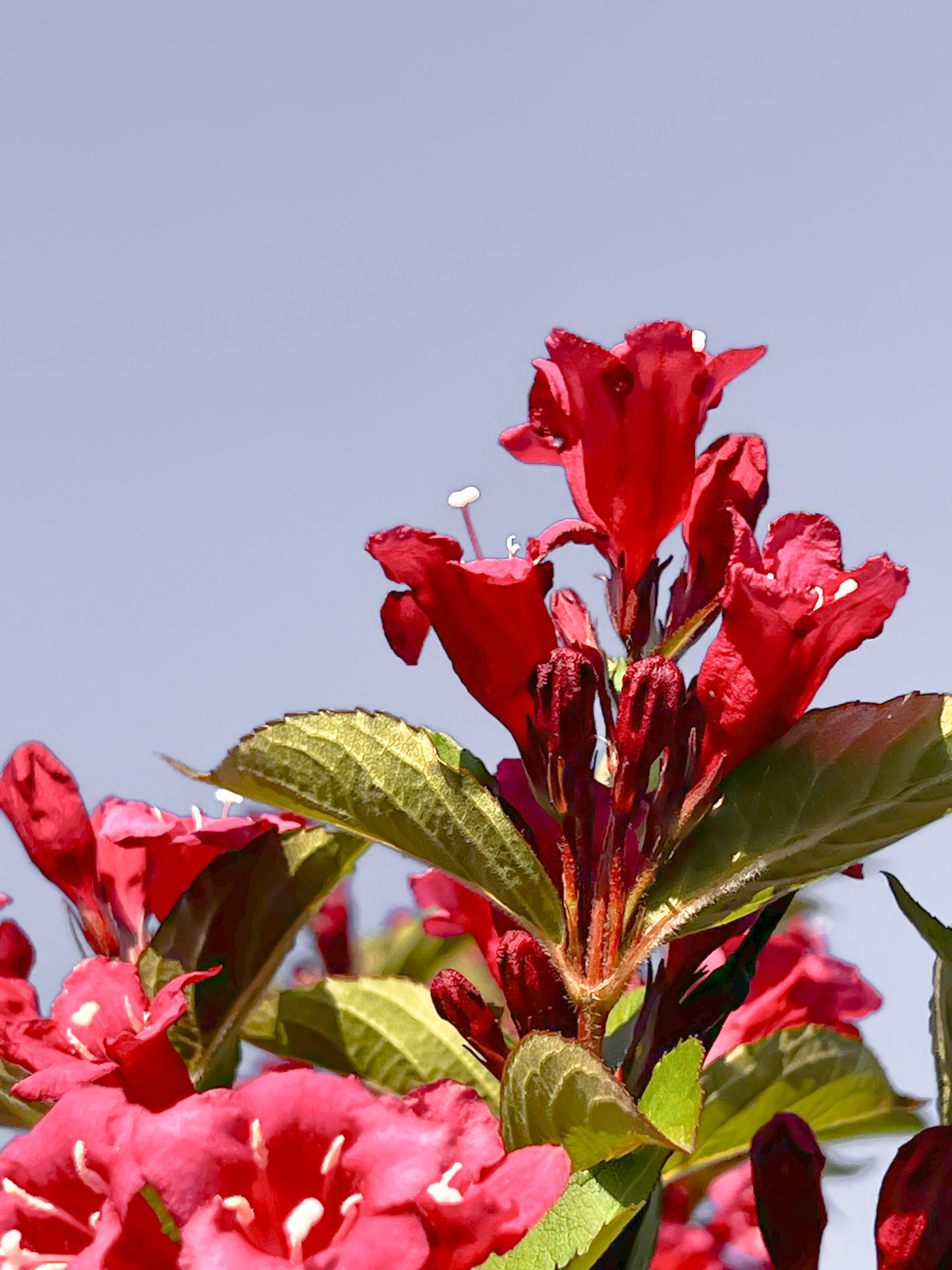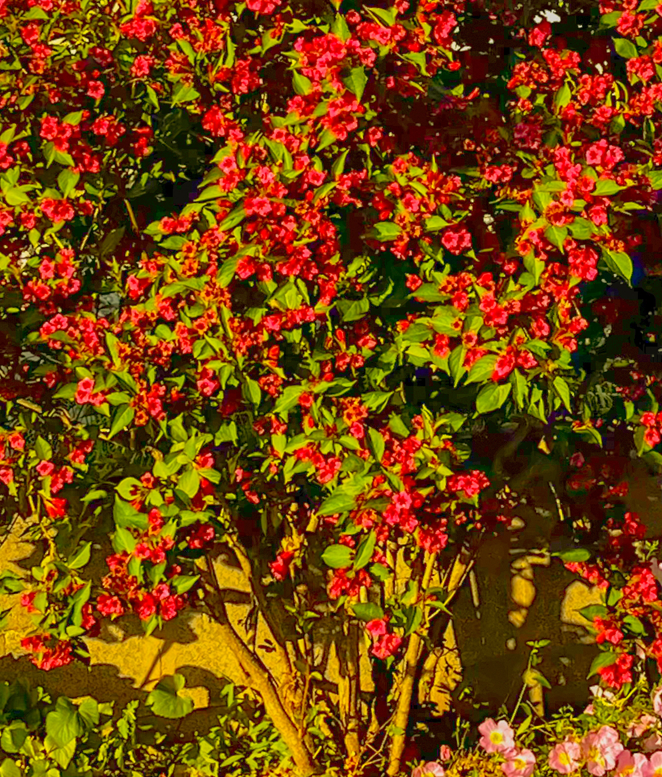 붉은 병꽃나무는 처음부터 붉은색으로 화사하게 피며 우리나라 전국에 있는 산과 일본, 중국에 분포되어 자라고 있는 낙엽관목입니다. 학명은 Weigela florida이고 다른 이름으로는 팟꽃나무, 병꽃나무, 조선대금화라고도 불립니다. 붉은 병꽃나무 형태는 나무 밑동부터 많은 줄기가 올라와 큰 포기를 이루며 높이는 2~3m까지 자랍니다.