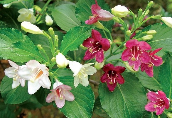 삼색병꽃나무는 원산지가 한국이며 인동과로 낙엽이지는 활엽관목입니다. 높이는 2~3m로 잎은 마주나고 꽃은 가지 끝에서 피며 꽃 색깔은 처음에 꽃봉오리가 벌어질 때 흰색으로 피었다가 점점 분홍색으로 변하면서 다시 붉은색으로 피는 게 특징입니다.