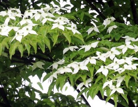 여름이 시작될 무렵 주위에 하얀 꽃을 많이 볼 수 있습니다. 샤스타데이지, 찔레꽃, 이팝꽃을 시작으로 꽃이 피는데 이 중에는 산딸나무도 같은 시기에 피는데요. 신록이 짙어지는 산에 산딸나무 꽃이 하얗게 피면 나비가 앉아 있는 것 같기도 하고 학이 앉아 있는 모습처럼 보이기도 하는데요. 4장의 십자 모양 꽃잎이 마주 보기로 붙어 있는 커다란 꽃잎은 꽃이 아니라 잎이 하얗게 변한 꽃받침이라고 합니다.