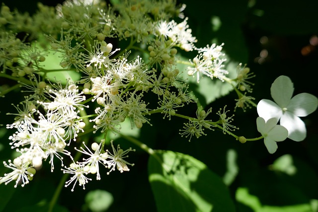 덩굴수국 페티올라리스 수국은 한국, 일본, 시베리아가 원산지로 키는 최대 15m까지 뻗어 나갈 수 있으며 느리게 자라는 식물입니다. 꽃은 늦은 봄부터 초여름에 흰색으로 피고 반그늘진 곳을 좋아하며, 주로 나무나 울타리, 구조물, 벽에 달라붙어서 살아가는 덩굴식물입니다.
