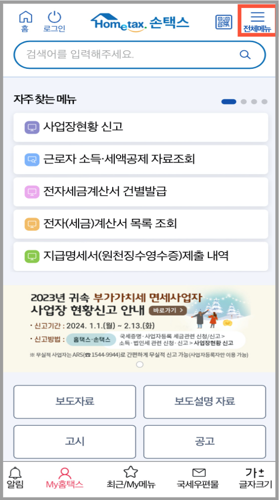 ✅ 어플을 설치한 후 로그인을 하고 우측 상단에 있는 전체메뉴를 선택합니다.