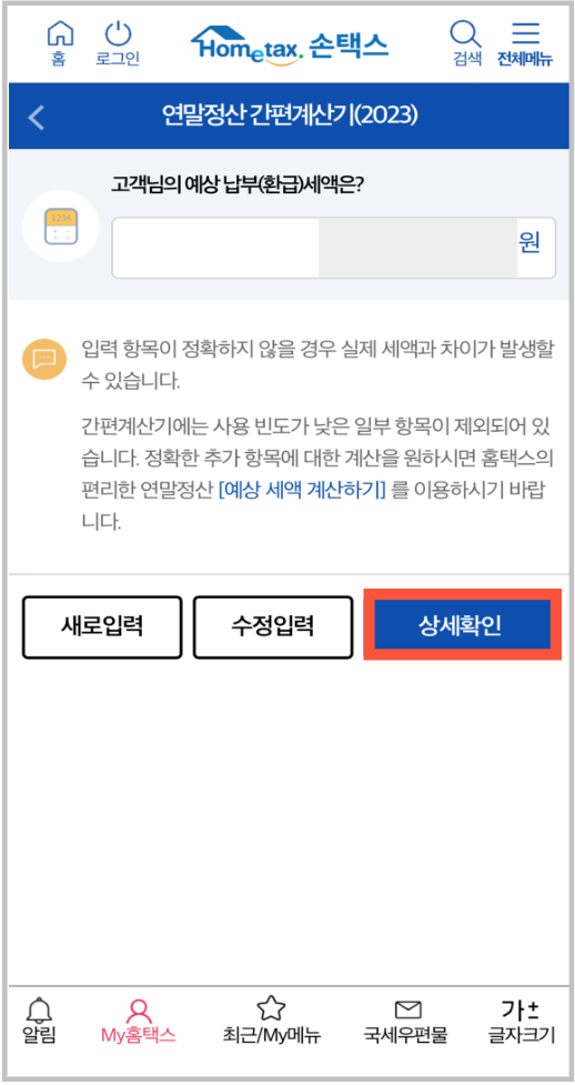 ✅ 하단에 결과확인을 누르시면 예상 납부(환급) 세액이 나오게 됩니다. 예상납부 세액을 더 알고 싶다면 아래 상세확인을 통해 내용을 확인할 수 있습니다.