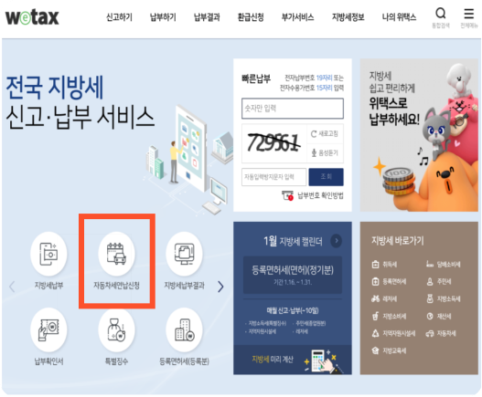 1. 연납신청은 위택스 홈페이지 접속 하시면 아래 화면에 [자동차세연납신청] 버튼을 누르시면 되겠습니다.