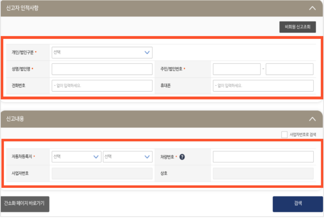 ● 주민/법인번호와 차량번호가 일치하는 경우에만 차량정보가 조회됩니다.
