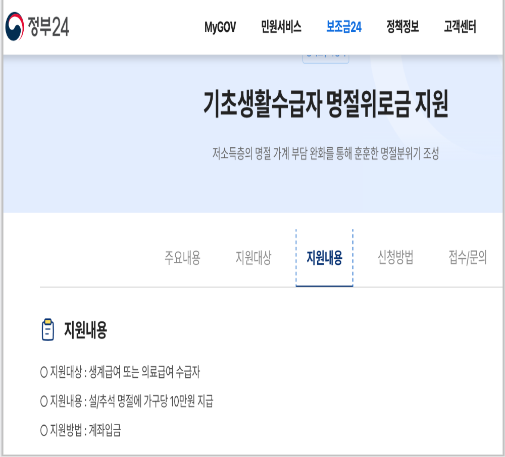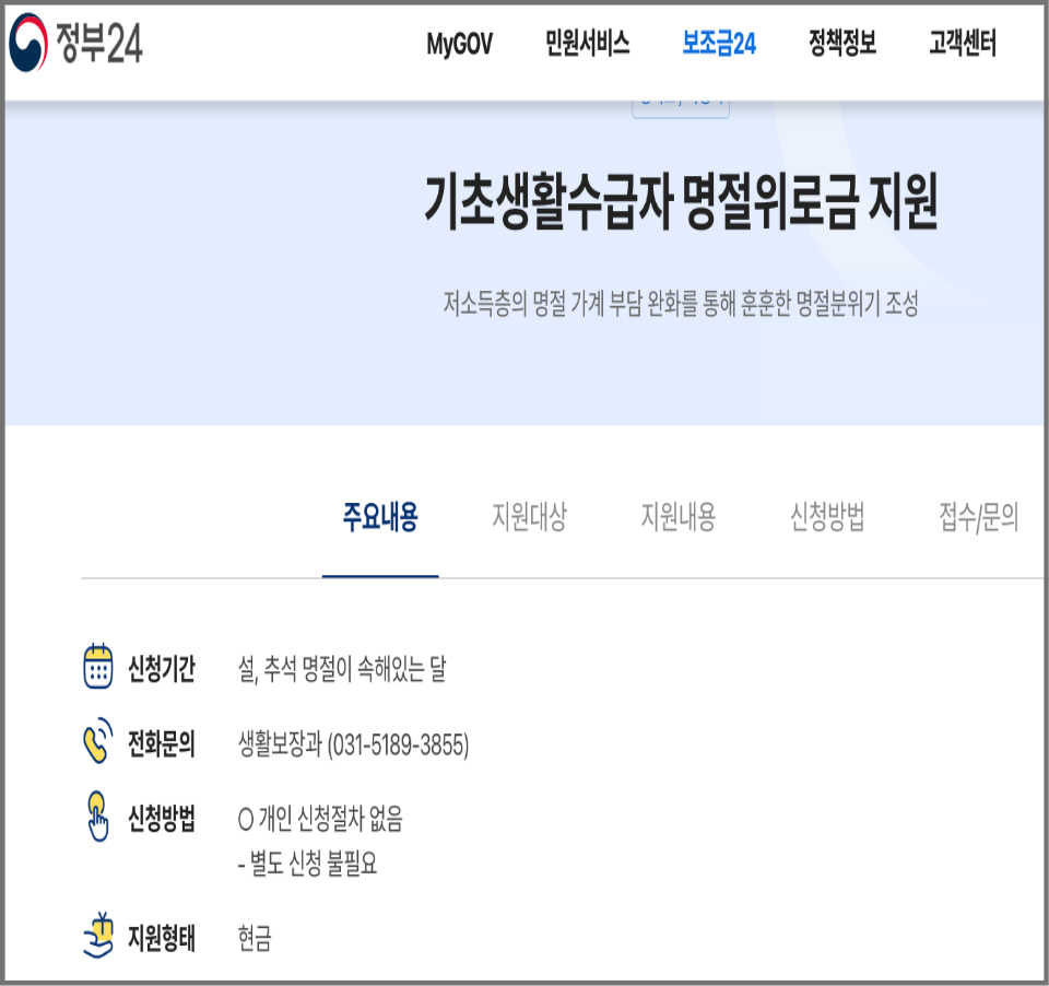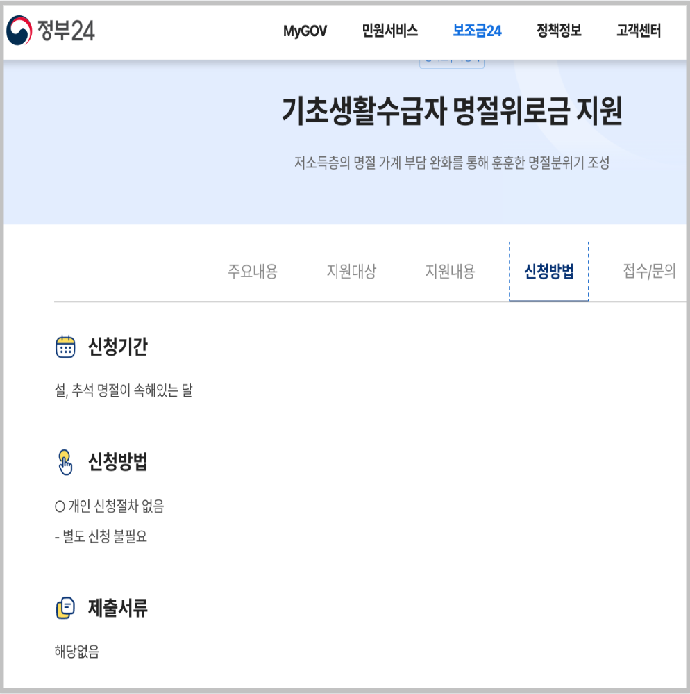 정부24 명절위로금은 각 지역에 있는 지자체에서 복지서비스를 받고 있는 생계급여와 의료급여 수급자를 대상으로 지원하고 있기 때문에 별도의 신청절차가 필요하지 않다고 합니다. 혹시라도 본인이 명절위로금을 받을 수 있는 자격이 되는데, 명단이 누락이 될 수 있으니 가까운 읍면동에 확인해 보시기 바랍니다.