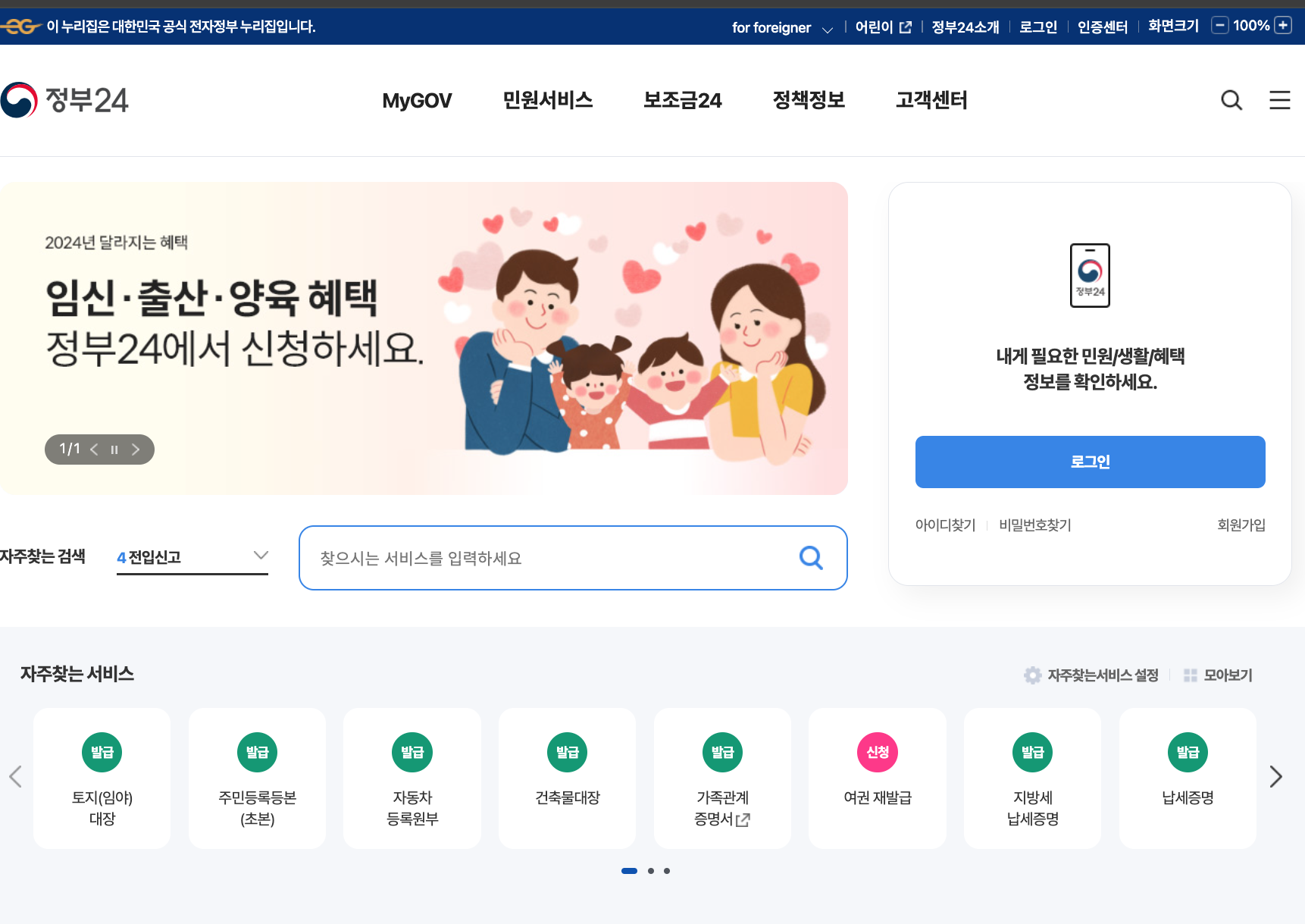 1. 정부24 홈페이지에 접속해 들어가면 각종 민원서비스와 복지서비스를 안내하는 대한민국 공식 전자정부 누리집 나오게 됩니다.