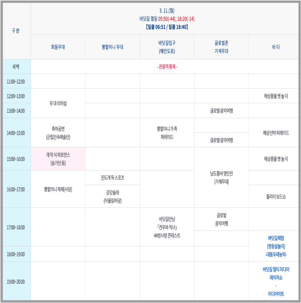 | 바닷길 횃불 퍼레이드 | 3월 11일 월요일 3월 12일 화요일 3월 13일 수요일 |