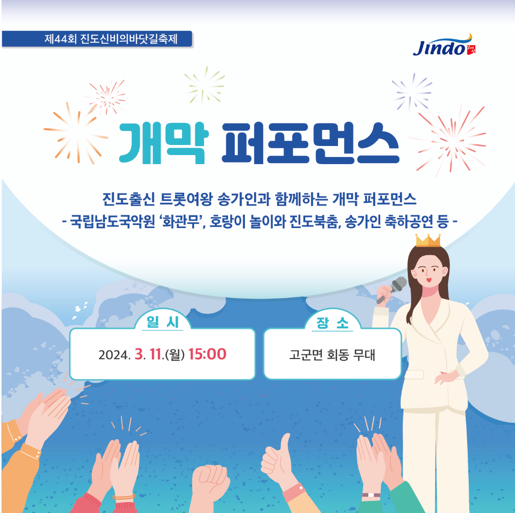 ▶ 오후 3시에 진도가 고향인 가수 송가인과 함께하는 개막식 축하 공연이 있고, 국립남도 국악원의 '화관무'와 호랑이 놀이, 진도북춤등이 진행될 예정입니다. 44쌍의 연인이 참여하는 바닷길만남 사랑콘테스트, 바닷길체험, 바닷길 멀티미디어 레이저쇼 다이어트 등이 예정되어 있습니다.