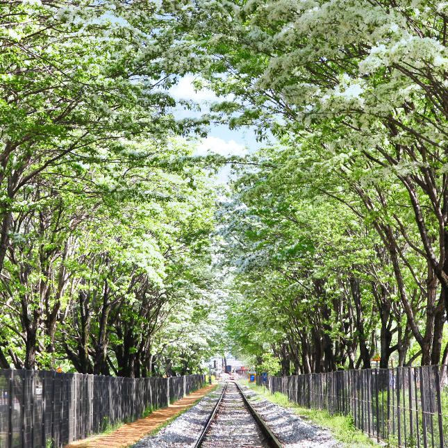 기차가 지나가는 전주 팔복동의 이팝나무 철길은 약 630m 구간으로 꽤 긴 꽃길로 알려지고 있습니다. 만개한 이팝나무꽃과 동화 속 같은 길을 보기 위해 전국에서 관광객들이 몰려드는 곳인데요. 평상시는 이곳을 개방하지 않지만 이팝나무 꽃피는 시기를 맞이해서 전주 시민과 관광객을 위해 철길을 개방한다고 합니다.