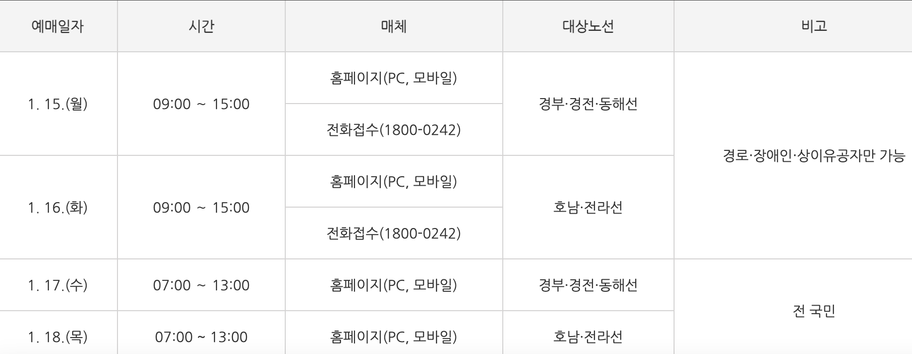 . 1월 15일(월) 09시 ~ 15시까지 : 경부, 경전, 동해선