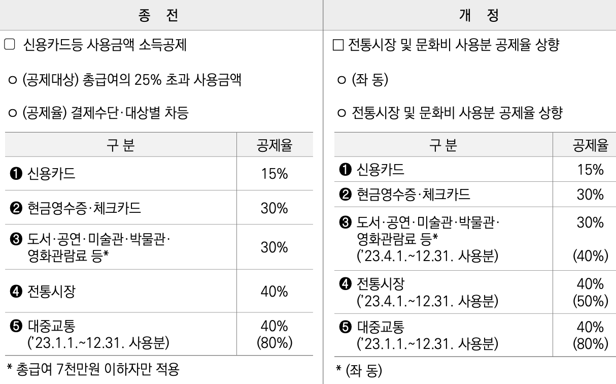 ▶ 전통시장 및 문화비 사용료 : 소득공제 10% 상향됨(23. 4. 1.~23. 12. 31 사용분)